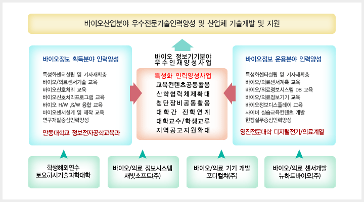 목표 : 바이오정보 운용분야 기술교육과 다양한 산업기술이 융합된 바이오정보 운용기술기반의 기술교육체제를 구축하고, 이를 통하여 바이오산업을 선도할 전문기술인력을 양성